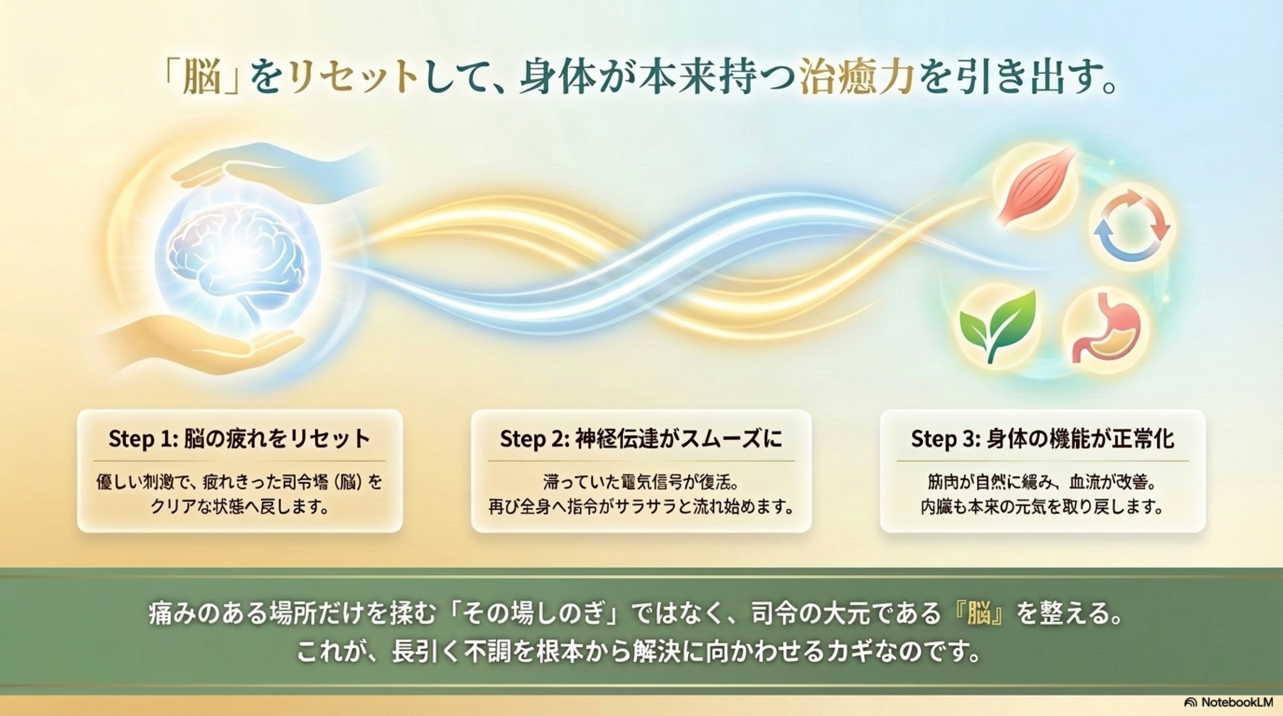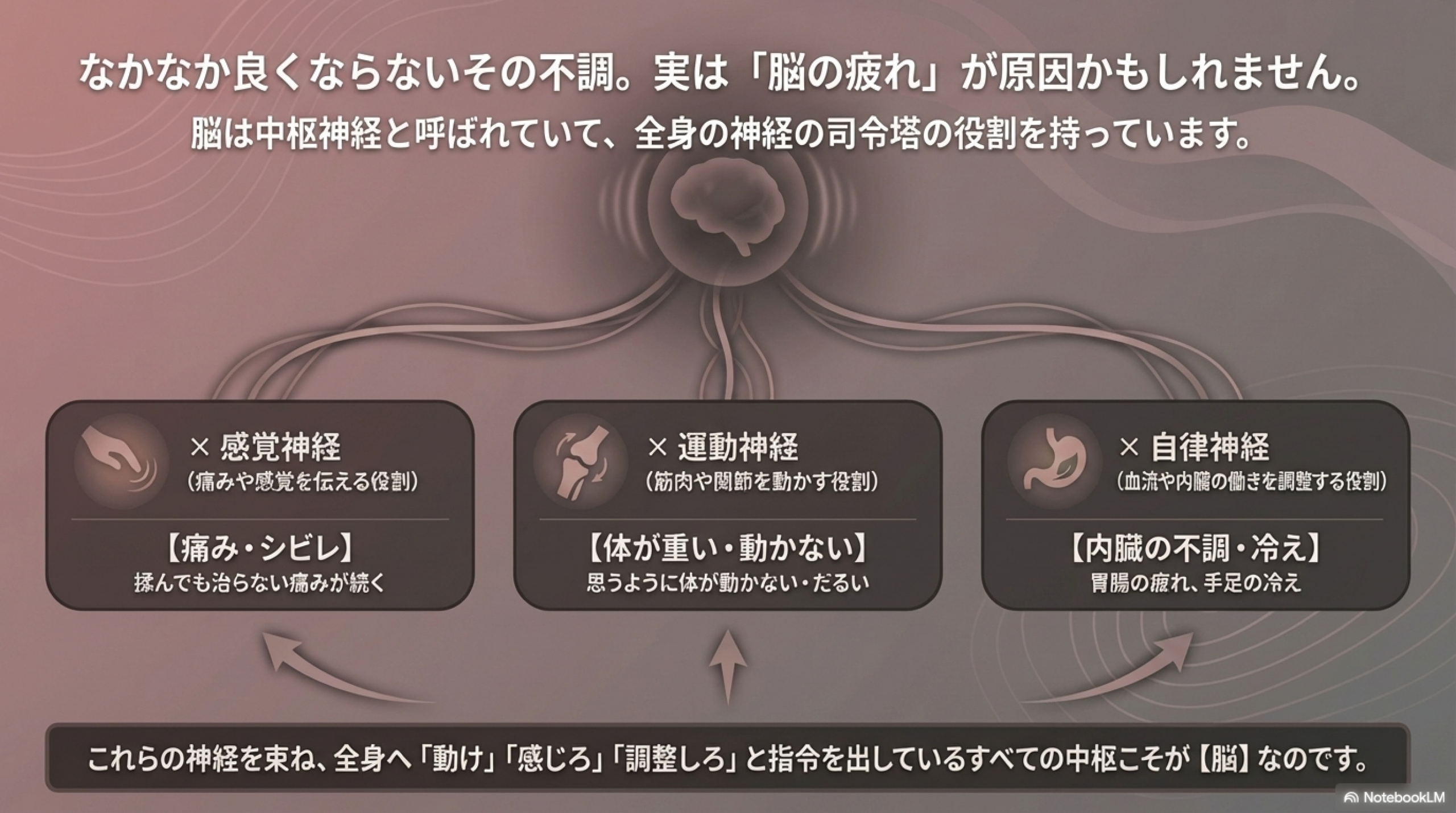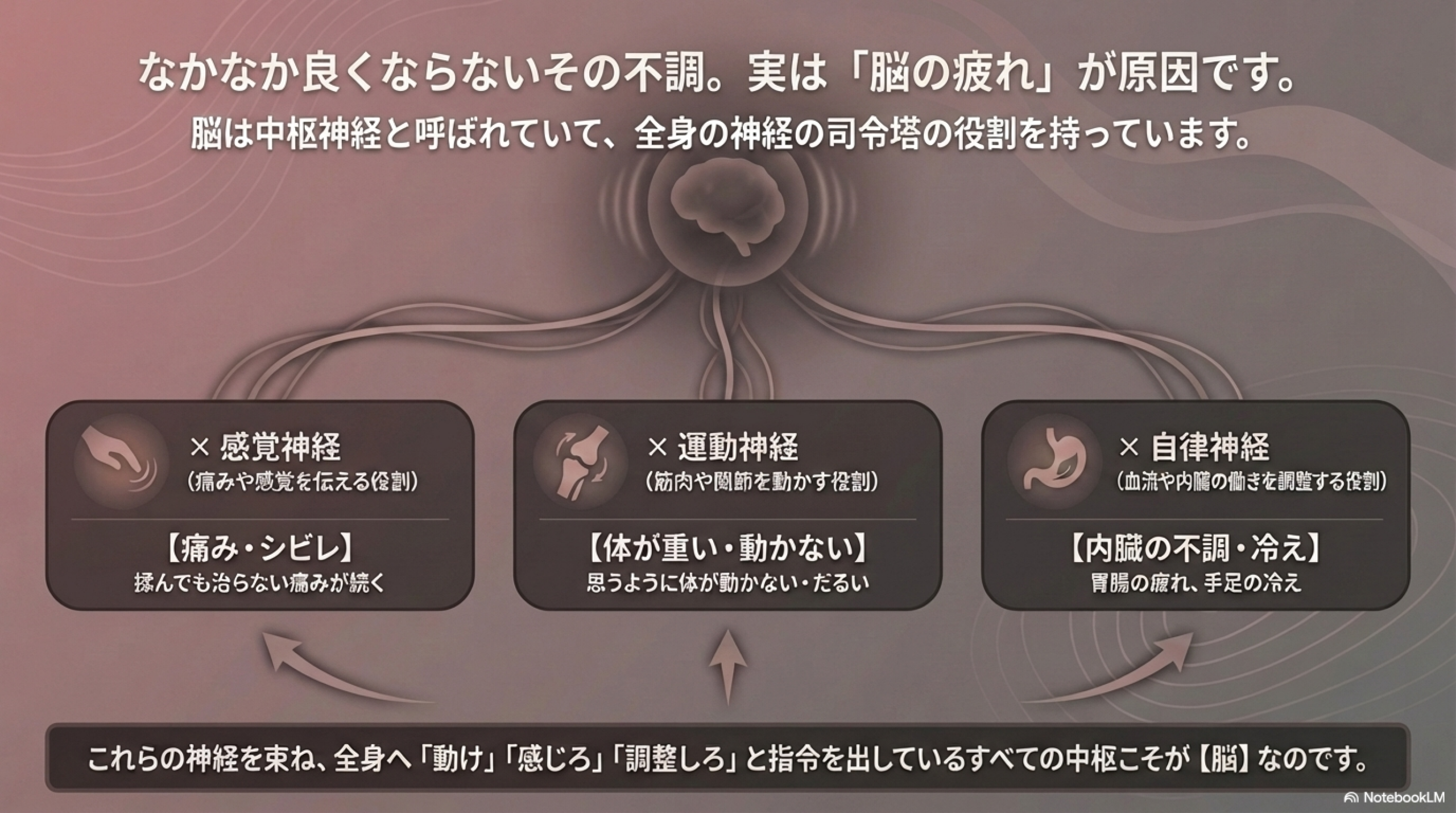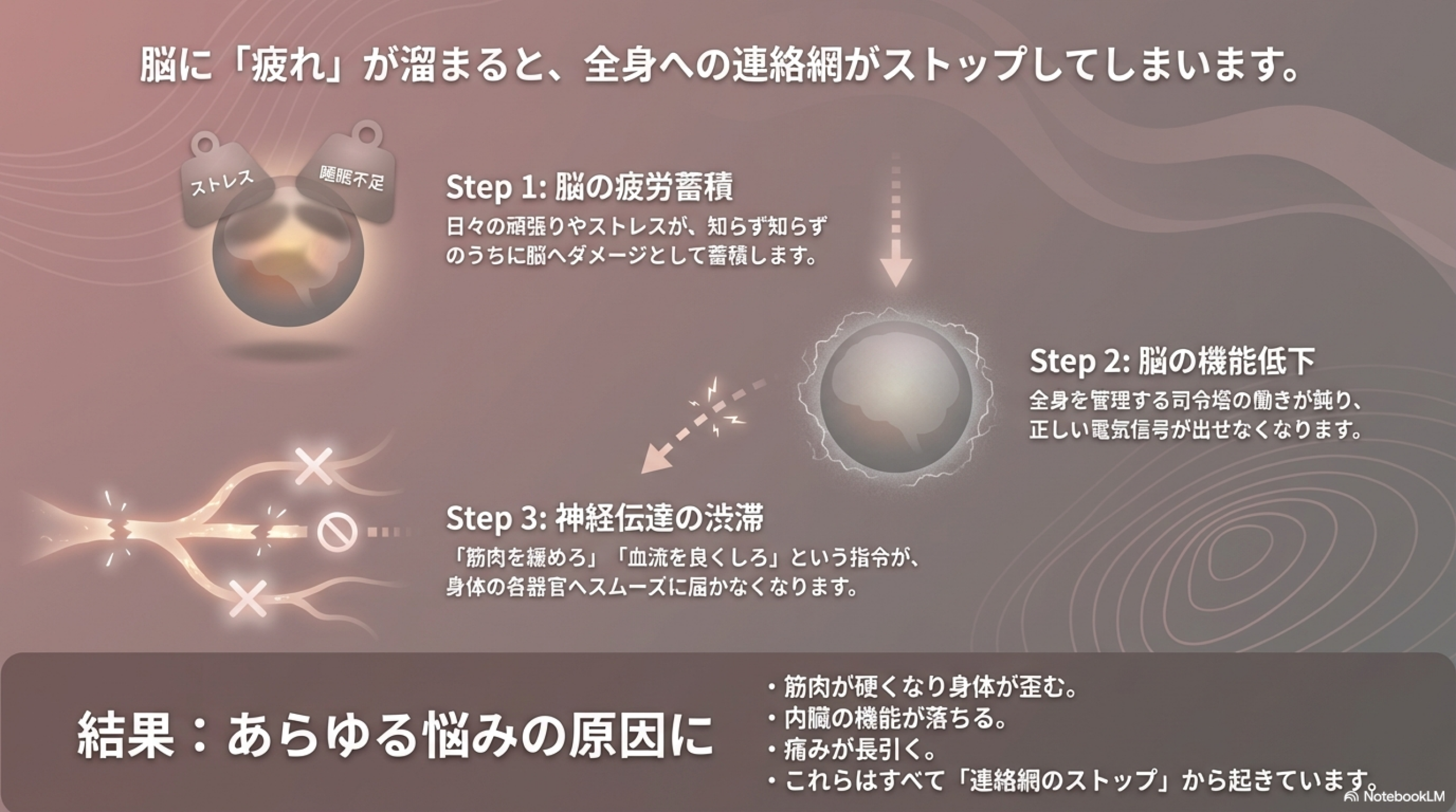 その答えは、これまでのケアがあなたの筋肉や関節しか見ておらず、司令塔である【脳】の疲れを見ていなかったからです。
